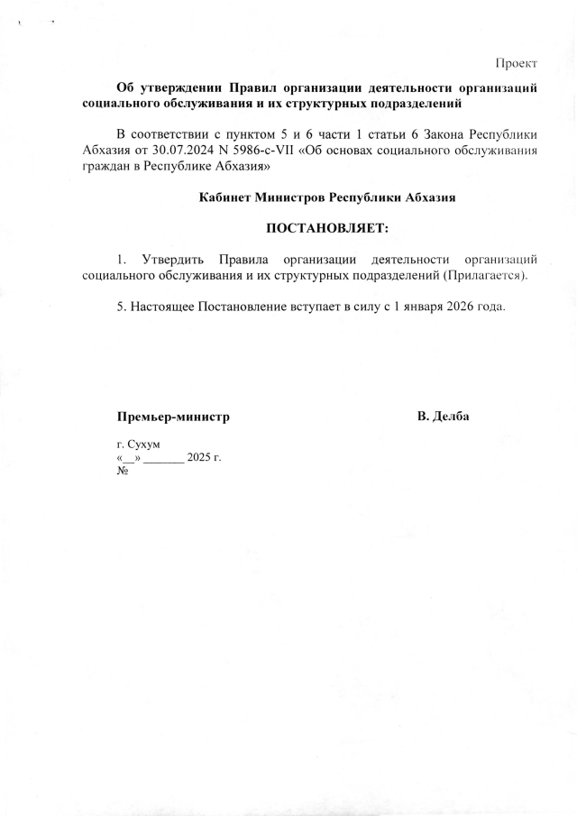 Постановление Кабинета Министров Республики Абхазия от 30.12.2025 №263 "Об утверждении Правил организации деятельности организаций социального обслуживания и их структурных подразделений"