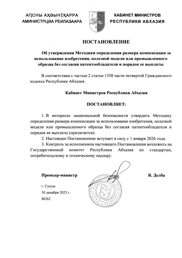 Постановление Кабинета Министров Республики Абхазия от 30.12.2025 №262 "Об утверждении Методики определения размера компенсации за использование изобретения, полезной модели или промышленного образца без согласия патентообладателя и порядок ее выплаты"