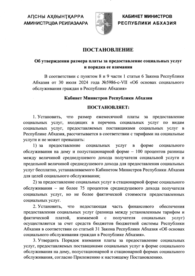 Постановление Кабинета Министров Республики Абхазия от 30.12.2025 №264 "Об утверждении размера платы за предоставление социальных услуг и порядка ее взимания"