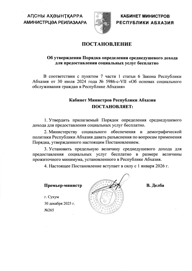 Постановление Кабинета Министров Республики Абхазия от 30.12.2025 №265 "Об утверждении Порядка определения среднедушевого дохода для предоставления социальных услуг бесплатно"