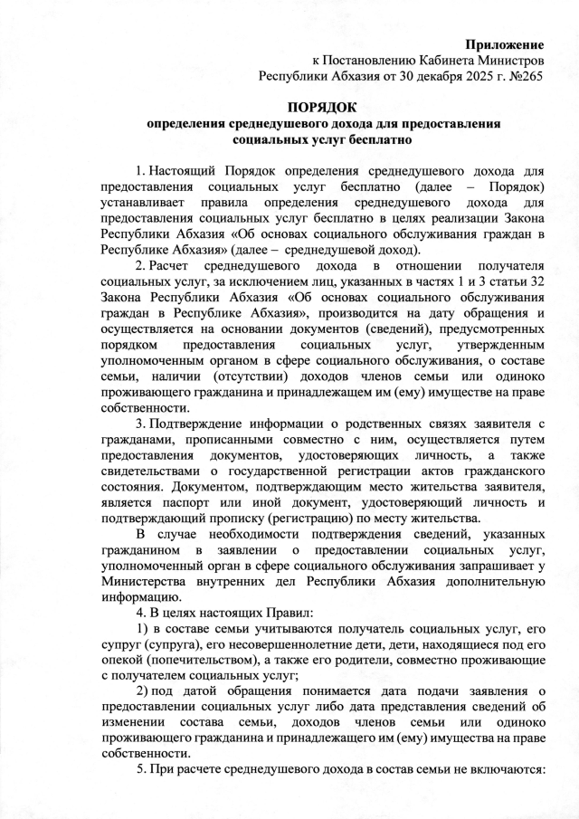 Постановление Кабинета Министров Республики Абхазия от 30.12.2025 №265 "Об утверждении Порядка определения среднедушевого дохода для предоставления социальных услуг бесплатно"