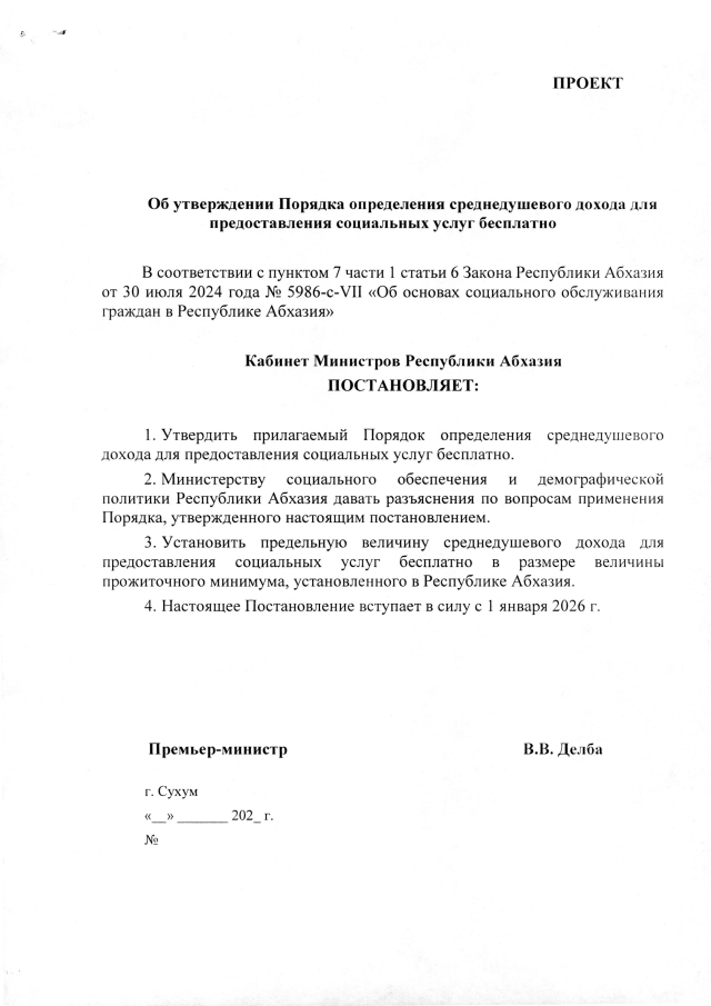 Постановление Кабинета Министров Республики Абхазия от 30.12.2025 №265 "Об утверждении Порядка определения среднедушевого дохода для предоставления социальных услуг бесплатно"