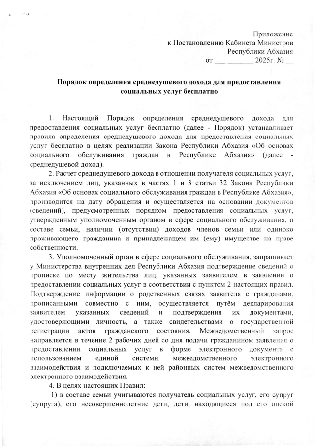 Постановление Кабинета Министров Республики Абхазия от 30.12.2025 №265 "Об утверждении Порядка определения среднедушевого дохода для предоставления социальных услуг бесплатно"