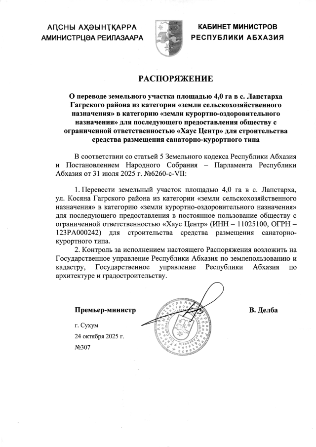РАСПОРЯЖЕНИЕ Кабинета Министров Республики Абхазия от 24.10.2025 №307 "О переводе земельного участка площадью 4,0 га в с. Лапстарха Гагрского района из категории <земли сельскохозяйственного назначения> в категорию <земли курортно-оздоровительного назначения> для последующего предоставления обществу с ограниченной ответственностью <Хаус Центр> для строительства средства размещения санаторно-курортного типа"