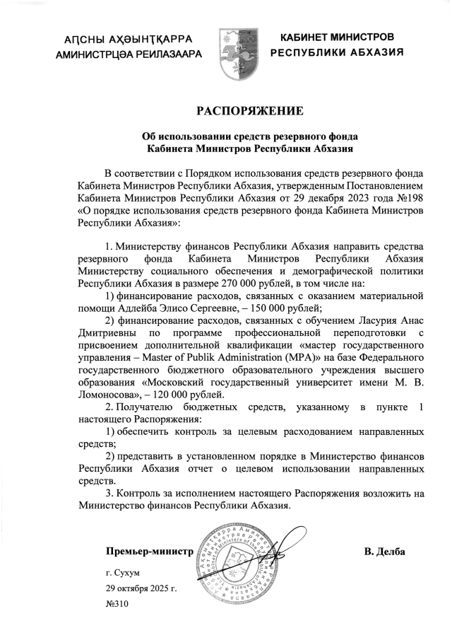 РАСПОРЯЖЕНИЕ Кабинета Министров Республики Абхазия от 29.10.2025 №310 "Об использовании средств резервного фонда Кабинета Министров Республики Абхазия"