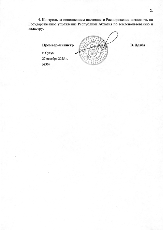 РАСПОРЯЖЕНИЕ Кабинета Министров Республики Абхазия от 27.10.2025 №309 "Об утверждении Порядка передачи или обеспечения доступа Государственного учреждения <Государственная кадастровая палата Республики Абхазия> к архивным данным государственных органов и организаций в целях переноса сведений об объектах недвижимости в кадастр недвижимости"
