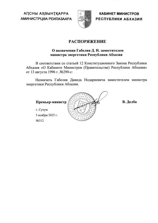 РАСПОРЯЖЕНИЕ Кабинета Министров Республики Абхазия от 3.11.2025 №312 "О назначении Габелия Д. Н. заместителем министра энергетики Республики Абхазия"