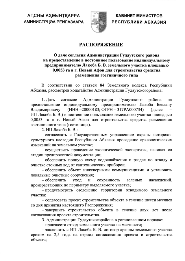 РАСПОРЯЖЕНИЕ Кабинета Министров Республики Абхазия от 4.11.2025 №314 "О даче согласия Администрации Гудаутского района на предоставление в постоянное пользование индивидуальному предпринимателю Лакоба Б. В. земельного участка площадью 0,0053 га в г. Новый Афон для строительства средства размещения гостиничного типа"