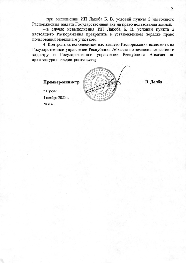 РАСПОРЯЖЕНИЕ Кабинета Министров Республики Абхазия от 4.11.2025 №314 "О даче согласия Администрации Гудаутского района на предоставление в постоянное пользование индивидуальному предпринимателю Лакоба Б. В. земельного участка площадью 0,0053 га в г. Новый Афон для строительства средства размещения гостиничного типа"