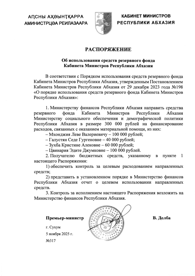 РАСПОРЯЖЕНИЕ Кабинета Министров Республики Абхазия от 5.11.2025 №317 "Об использовании средств резервного фонда Кабинета Министров Республики Абхазия"