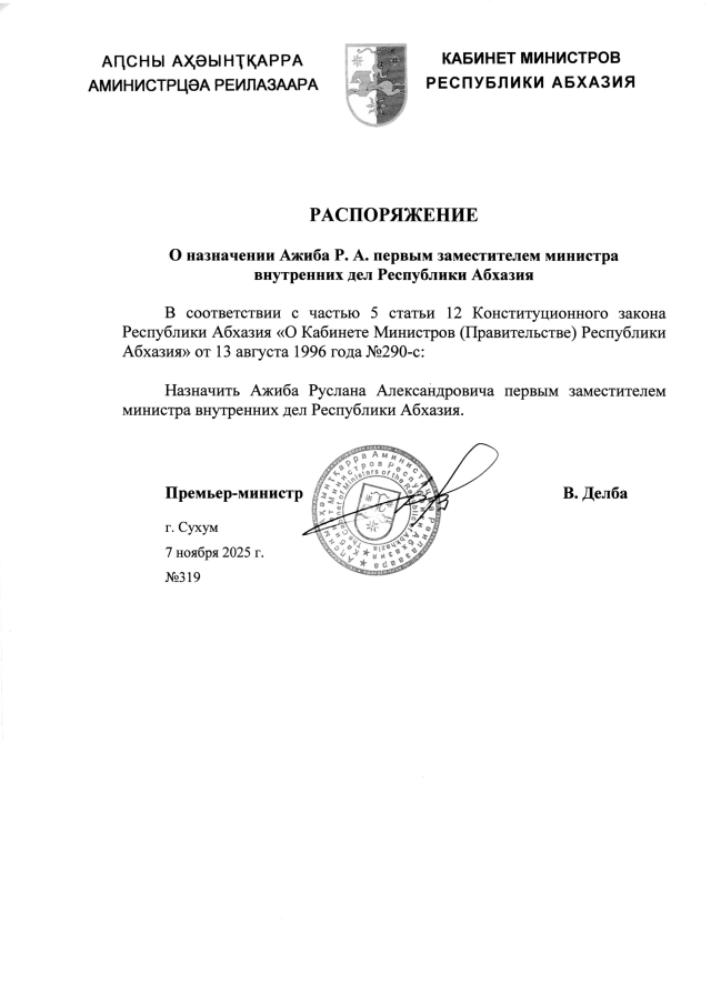 РАСПОРЯЖЕНИЕ Кабинета Министров Республики Абхазия от 7.11.2025 №319 "О назначении Ажиба Р. А. первым заместителем министра внутренних дел Республики Абхазия"