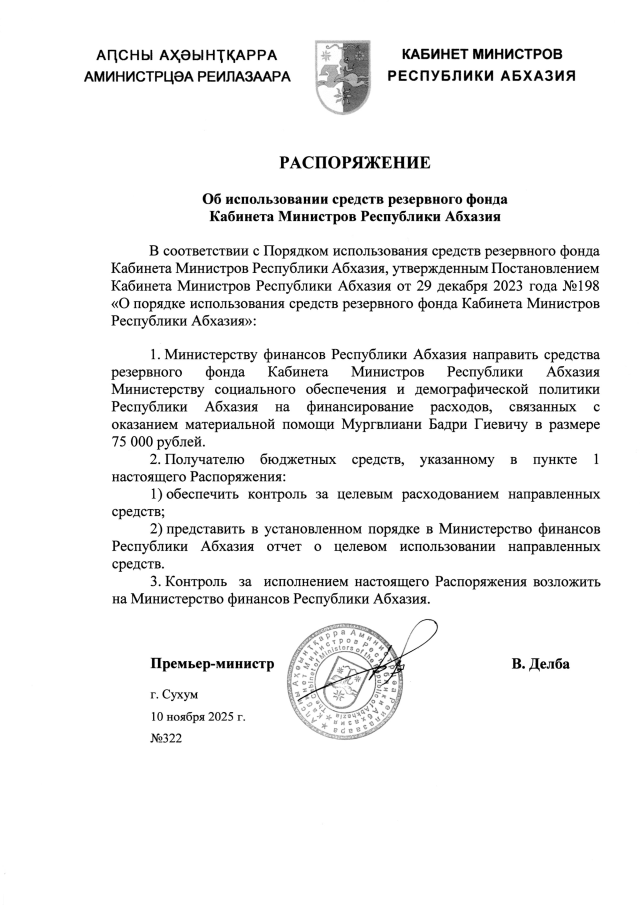 РАСПОРЯЖЕНИЕ Кабинета Министров Республики Абхазия от 10.11.2025 №322 "Об использовании средств резервного фонда Кабинета Министров Республики Абхазия"