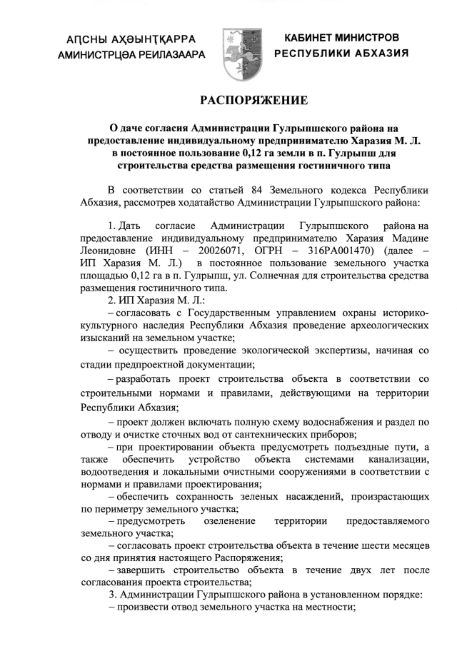 РАСПОРЯЖЕНИЕ Кабинета Министров Республики Абхазия от 12.11.2025 №323 "О даче согласия Администрации Гулрыпшского района на предоставление индивидуальному предпринимателю Харазия М. Л.в постоянное пользование 0,12 га земли в п. Гулрыпш для строительства средства размещения гостиничного типа"
