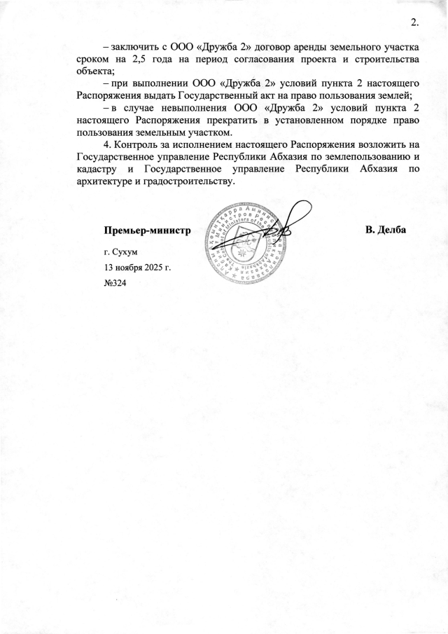 РАСПОРЯЖЕНИЕ Кабинета Министров Республики Абхазия от 13.11.2025 №324 "О даче согласия Администрации Гудаутского района на предоставление в постоянное пользование обществу с ограниченной ответственностью <Дружба 2> земельного участка площадью 0,78 га в с. Куланырхуа для строительства средства размещения санаторно-курортного типа"