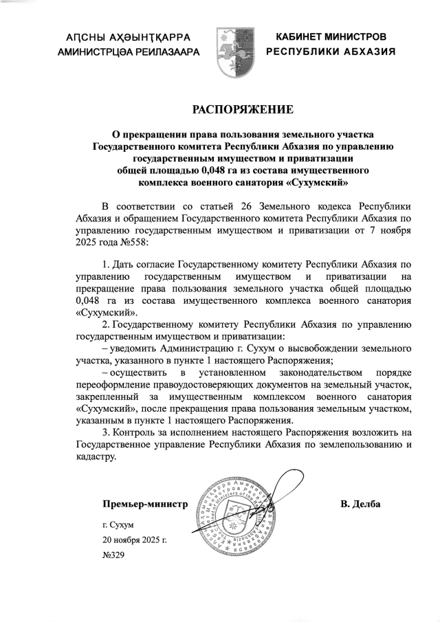 РАСПОРЯЖЕНИЕ Кабинета Министров Республики Абхазия от 20.11.2025 №329 "О прекращении права пользования земельного участка Государственного комитета Республики Абхазия по управлению государственным имуществом и приватизации общей площадью 0,048 га из состава имущественного комплекса военного санатория <Сухумский>"