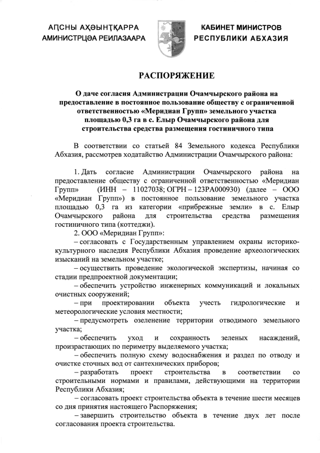РАСПОРЯЖЕНИЕ Кабинета Министров Республики Абхазия от 20.11.2025 №331 "О даче согласия Администрации Очамчырского района на предоставление в постоянное пользование обществу с ограниченной ответственностью <Меридиан Групп> земельного участка площадью 0,3 га в с. Елыр Очамчырского района для строительства средства размещения гостиничного типа"