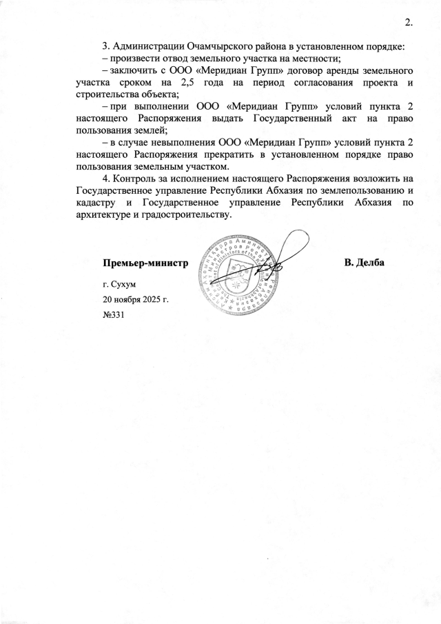 РАСПОРЯЖЕНИЕ Кабинета Министров Республики Абхазия от 20.11.2025 №331 "О даче согласия Администрации Очамчырского района на предоставление в постоянное пользование обществу с ограниченной ответственностью <Меридиан Групп> земельного участка площадью 0,3 га в с. Елыр Очамчырского района для строительства средства размещения гостиничного типа"