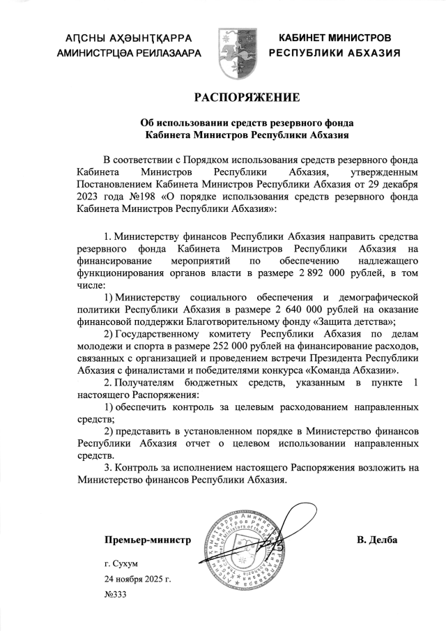 РАСПОРЯЖЕНИЕ Кабинета Министров Республики Абхазия от 24.11.2025 №333 "Об использовании средств резервного фонда Кабинета Министров Республики Абхазия"
