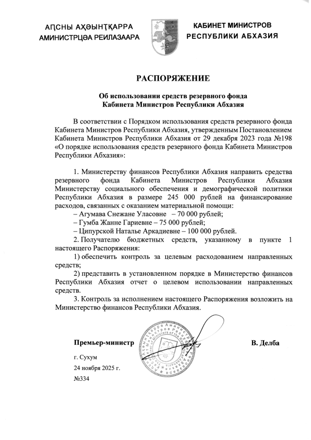 РАСПОРЯЖЕНИЕ Кабинета Министров Республики Абхазия от 24.11.2025 №334 "Об использовании средств резервного фонда Кабинета Министров Республики Абхазия"