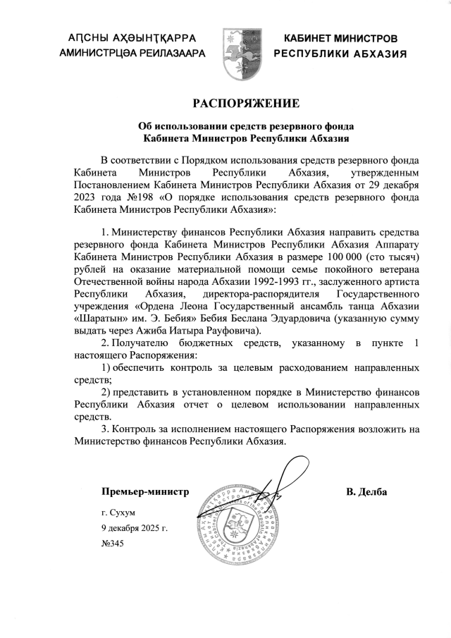 РАСПОРЯЖЕНИЕ Кабинета Министров Республики Абхазия от 9.12.2025 №345 "Об использовании средств резервного фонда Кабинета Министров Республики Абхазия"