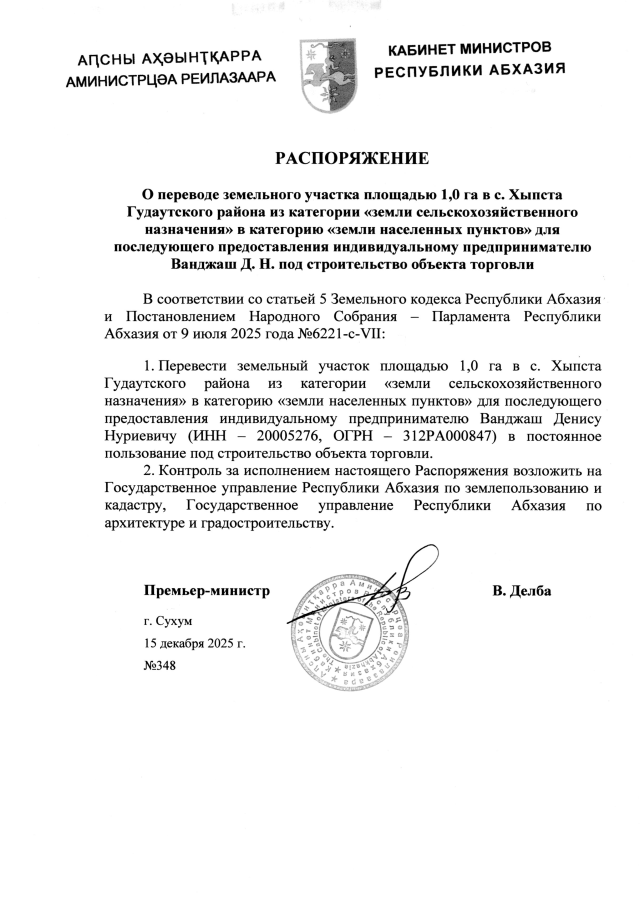 РАСПОРЯЖЕНИЕ Кабинета Министров Республики Абхазия от 15.12.2025 №348 "О переводе земельного участка площадью 1,0 га в с. Хыпста Гудаутского района из категории <земли сельскохозяйственного назначения> в категорию <земли населенных пунктов> для последующего предоставления индивидуальному предпринимателю Ванджаш Д. Н. под строительство объекта торговли"