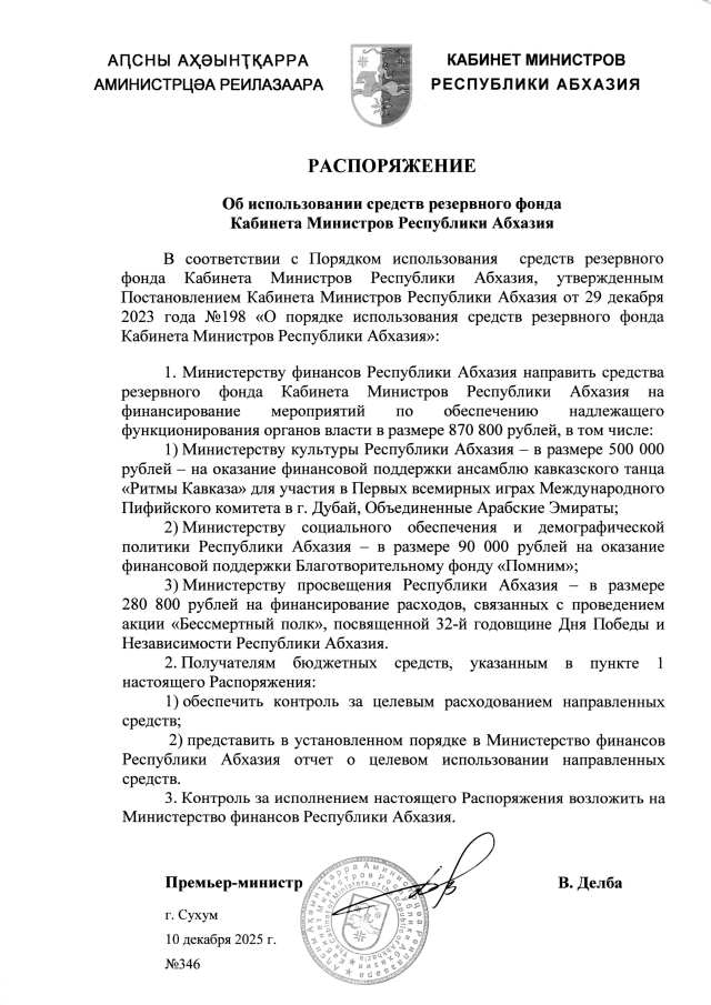 РАСПОРЯЖЕНИЕ Кабинета Министров Республики Абхазия от 10.12.2025 №346 "Об использовании средств резервного фонда Кабинета Министров Республики Абхазия"