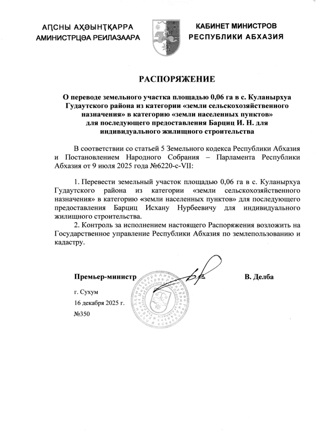 РАСПОРЯЖЕНИЕ Кабинета Министров Республики Абхазия от 16.12.2025 №350 "О переводе земельного участка площадью 0,06 га в с. Куланырхуа Гудаутского района из категории <земли сельскохозяйственного назначения> в категорию <земли населенных пунктов> для последующего предоставления Барциц И. Н. для индивидуального жилищного строительства"
