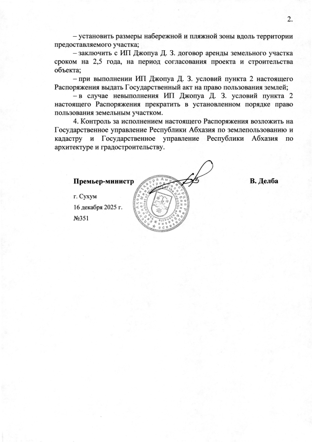 РАСПОРЯЖЕНИЕ Кабинета Министров Республики Абхазия от 16.12.2025 №351 "О даче согласия Администрации Очамчырского района на предоставление в постоянное пользование индивидуальному предпринимателю Джопуа Д. З. земельного участка площадью 0,55 га в с. Елыр для строительства средства размещения санаторно-курортного типа (базы отдыха)"