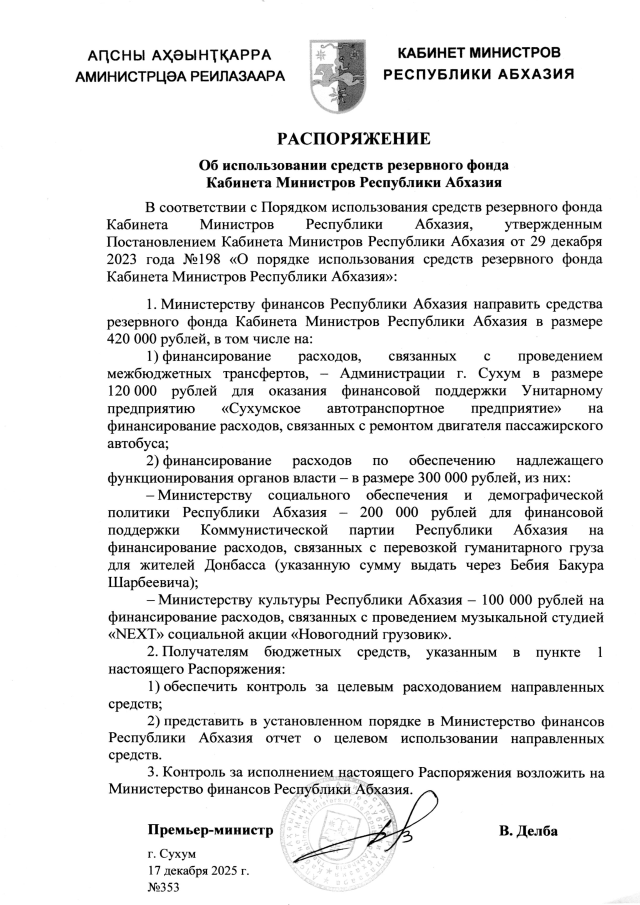 РАСПОРЯЖЕНИЕ Кабинета Министров Республики Абхазия от 17.12.2025 №353 "Об использовании средств резервного фонда Кабинета Министров Республики Абхазия"