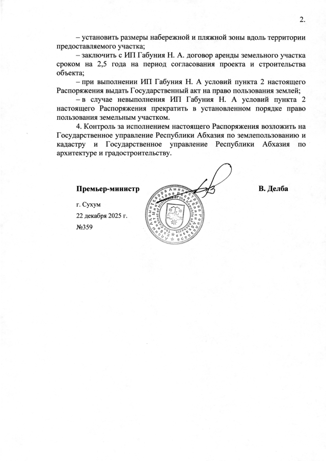РАСПОРЯЖЕНИЕ Кабинета Министров Республики Абхазия от 22.12.2025 №359 "О даче согласия Администрации Очамчырского района на предоставление в постоянное пользование индивидуальному предпринимателю Габуния Н. А. земельного участка площадью 0,47 га для строительства средства размещения гостиничного типа (коттеджи)"