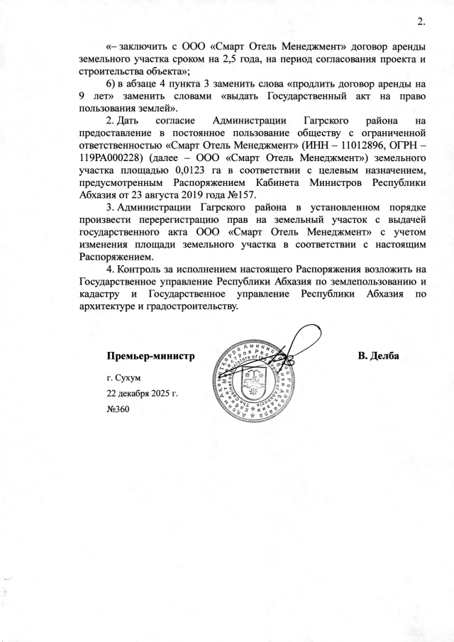 РАСПОРЯЖЕНИЕ Кабинета Министров Республики Абхазия от 22.12.2025 №360 "О внесении изменений в Распоряжение Кабинета Министров Республики Абхазия от 23 августа 2019 года № 157 и даче согласия Администрации Гагрского района на предоставление в постоянное пользование обществу с ограниченной ответственностью <Смарт Отель Менеджмент> земельного участка площадью 0,0123 га для расширения территории объекта общественного питания (кафе)"