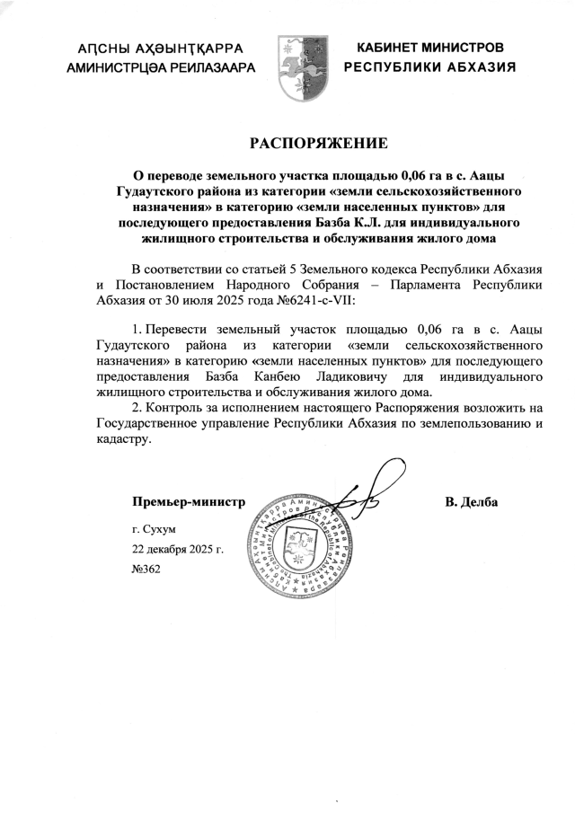 РАСПОРЯЖЕНИЕ Кабинета Министров Республики Абхазия от 22.12.2025 №362 "О переводе земельного участка площадью 0,06 га в с. Аацы Гудаутского района из категории <земли сельскохозяйственного назначения> в категорию <земли населенных пунктов> для последующего предоставления Базба К.Л. для индивидуального жилищного строительства и обслуживания жилого дома"