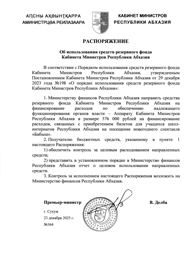 РАСПОРЯЖЕНИЕ Кабинета Министров Республики Абхазия от 23.12.2025 №364 "Об использовании средств резервного фонда Кабинета Министров Республики Абхазия"
