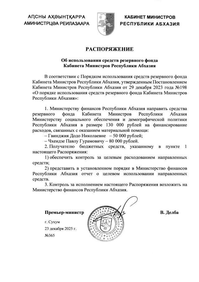 РАСПОРЯЖЕНИЕ Кабинета Министров Республики Абхазия от 23.12.2025 №365 "Об использовании средств резервного фонда Кабинета Министров Республики Абхазия"