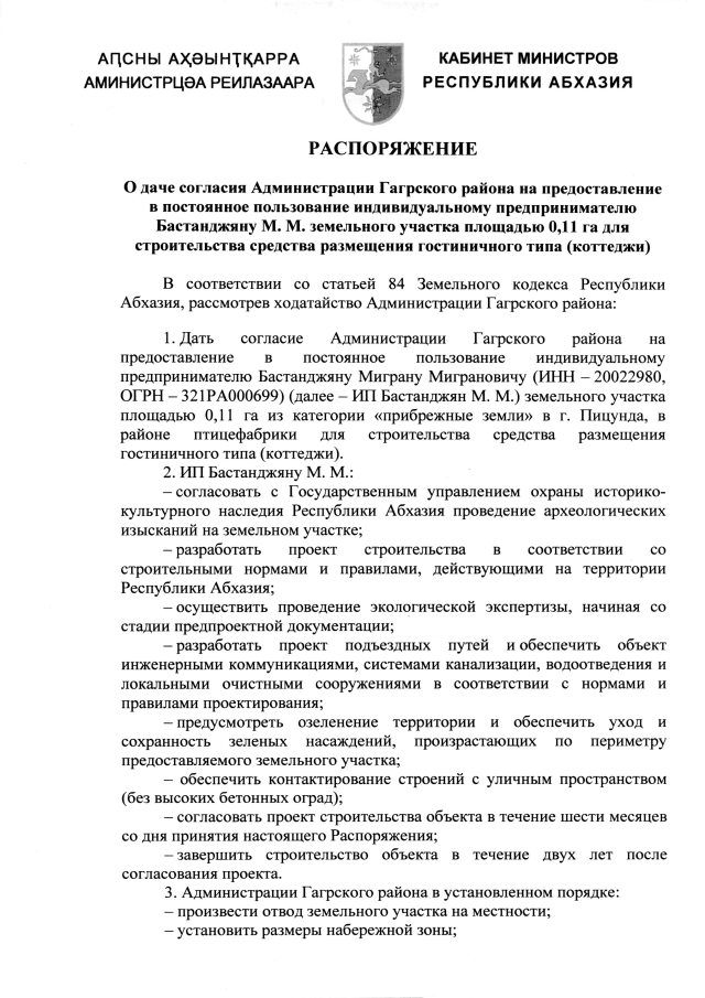РАСПОРЯЖЕНИЕ Кабинета Министров Республики Абхазия от 24.12.2025 №367 "О даче согласия Администрации Гагрского района на предоставление в постоянное пользование индивидуальному предпринимателю Бастанджяну М. М. земельного участка площадью 0,11 га для строительства средства размещения гостиничного типа (коттеджи)"