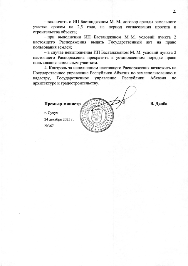 РАСПОРЯЖЕНИЕ Кабинета Министров Республики Абхазия от 24.12.2025 №367 "О даче согласия Администрации Гагрского района на предоставление в постоянное пользование индивидуальному предпринимателю Бастанджяну М. М. земельного участка площадью 0,11 га для строительства средства размещения гостиничного типа (коттеджи)"
