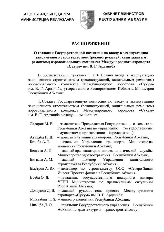 РАСПОРЯЖЕНИЕ Кабинета Министров Республики Абхазия от 25.11.2025 №334а "О создании Государственной комиссии по вводу в эксплуатацию законченного строительством (реконструкцией, капитальным ремонтом) аэровокзального комплекса Международного аэропорта <Сухум> им. В. Г. Ардзинба"