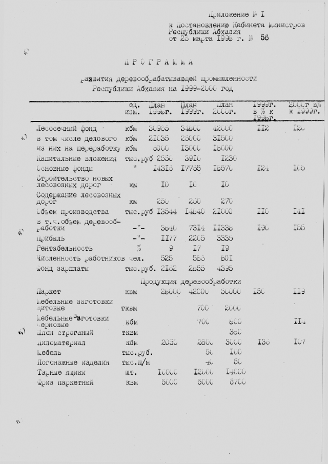 Постановление Кабинета Министров Республики Абхазия от 26.03.1998 № 56 "О программе развития лесоперерабатывающей промышленности в Республике Абхазия до 2000 года"