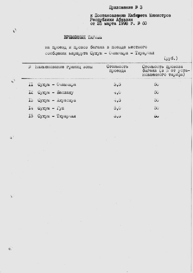 Постановление Кабинета Министров Республики Абхазия от 26.03.1998 № 60 "О временных тарифах на проезд и провоз багажа в электропоездах и поездах местного сообщения по территориии Республики Абхазия"