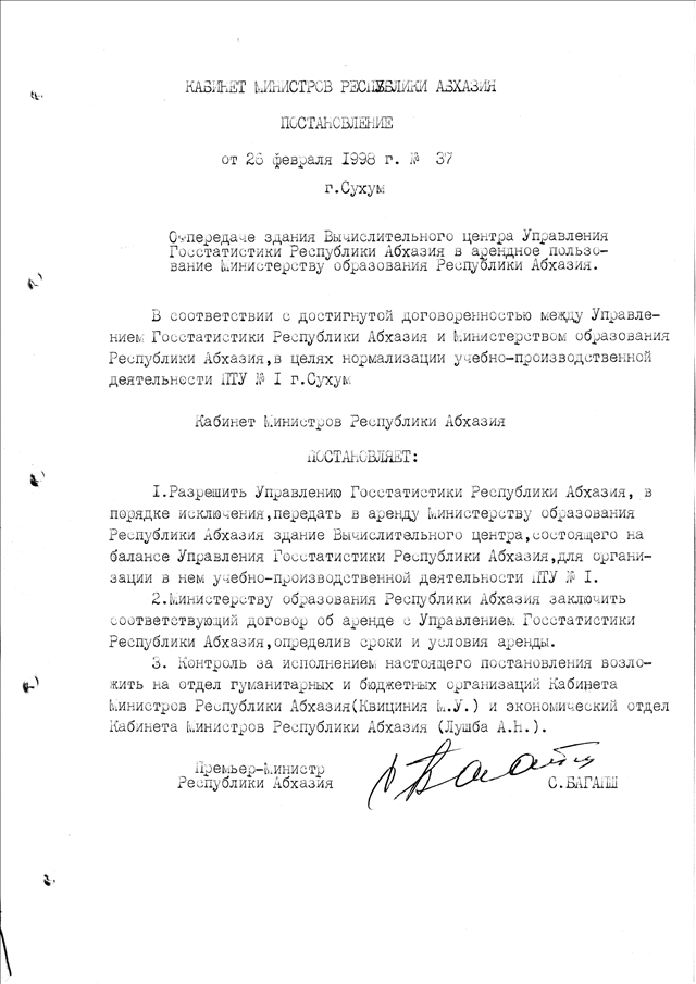 Постановление Кабинета Министров Республики Абхазия от 26.02.1998 № 37 "О передаче здания Вычислительного центра Управления Госстатистики Республики Абхазия в арендное пользование Министерству образования Республики Абхазия"