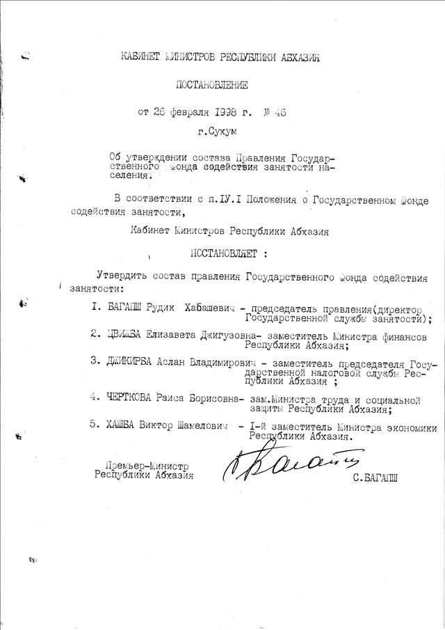 Постановление Кабинета Министров Республики Абхазия от 26.02.1998 № 46 "Об утверждении состава Правления Государственного Фонда содействия занятости населения"