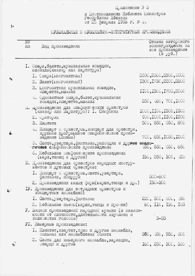 Постановление Кабинета Министров Республики Абхазия от 26.02.1998 № 44 "Об утверждении ставок авторского вознаграждения за издание произведений науки, литературы и искусства (временный порядок)"