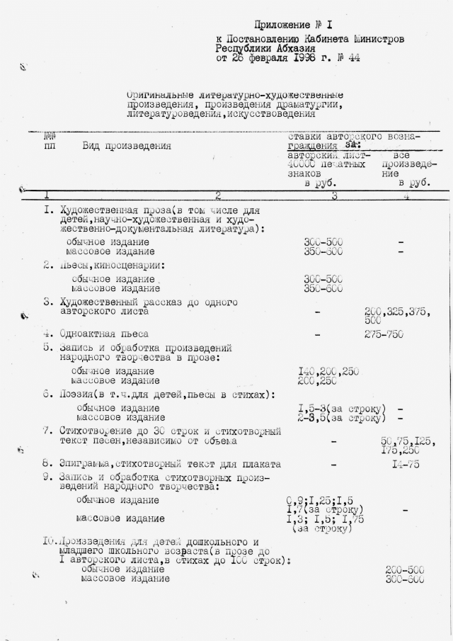 Постановление Кабинета Министров Республики Абхазия от 26.02.1998 № 44 "Об утверждении ставок авторского вознаграждения за издание произведений науки, литературы и искусства (временный порядок)"