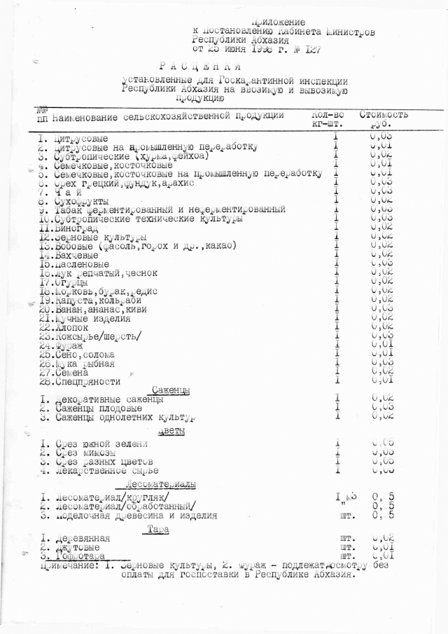 Постановление Кабинета Министров Республики Абхазия от 25.06.1998 № 127 "Об утверждении временных расценок Госкарантинной инспекции на ввозимую и вывозимую сельхозпродукцию"