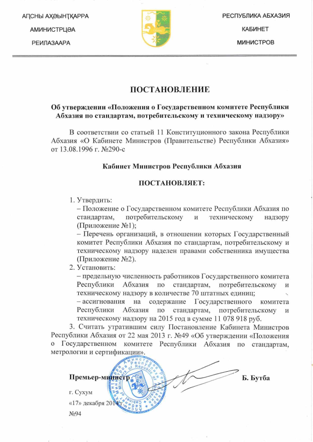 Постановление Кабинета Министров Республики Абхазия от 17.12.2014 № 94 "Об утверждении "Положения о Государственном комитете Республики Абхазия по стандартам, потребительскому и техническому надзору"