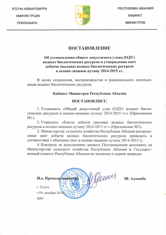 Постановление Кабинета Министров Республики Абхазия от 19.12.2014 № 95 "Об установлении общего допустимого улова (ОДУ) водных биологических ресурсов и утверждении квот добычи (вылова) водных биологических ресурсов в осенне-зимнюю путину 2014-2015 гг."