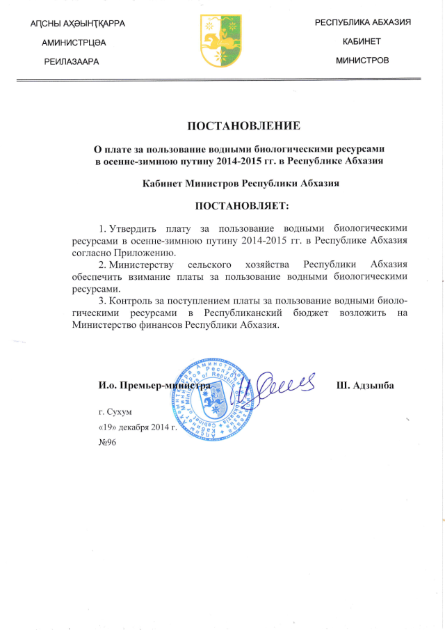 Постановление Кабинета Министров Республики Абхазия от 19.12.2014 № 96 "О плате за пользование водными биологическими ресурсами в осенне-зимнюю путину 2014-2015 гг. в Республике Абхазия"