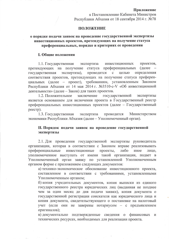Постановление Кабинета Министров Республики Абхазия от 18.09.2014 № 78 "Об утверждении "Положения о порядке подачи заявок на проведение государственной экспертизы инвестиционных проектов, претендующих на получение статуса преференциальных, порядке и критериях ее проведения"