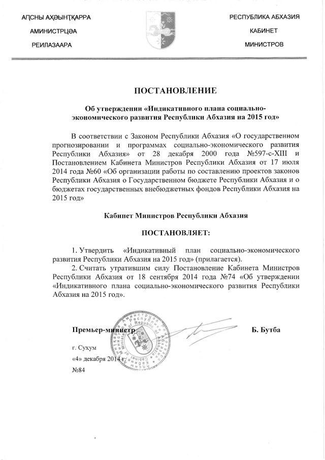 Постановление Кабинета Министров Республики Абхазия от 04.12.2014 № 84 "Об утверждении "Индикативного плана социально-экономического развития Республики Абхазия на 2015 год"
