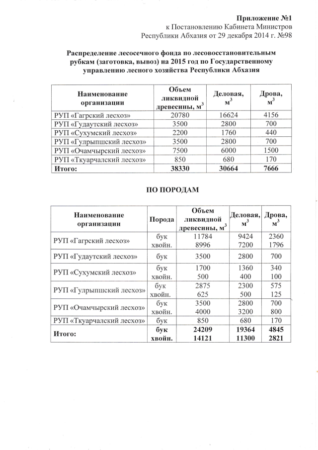 Постановление Кабинета Министров Республики Абхазия от 29.12.2014 № 98 "Об утверждении лесосечного фонда и лесовосстановительных работ в лесах Республики Абхазия на 2015 год"
